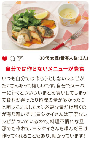 - 毎日、家事と仕事と育児でへとへと。買い物に行っている時間もないし、メニューもマンネリ化していました。でもこちらを利用するようになって効率的に家事ができるように。おいしい料理に家族も喜んでいます。