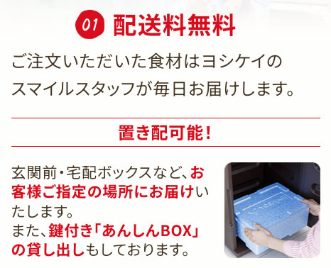 しかも「置き配を頼みたいけど宅配ボックスの準備がないよ」という方も大丈夫。ヨシケイでは鍵付きの「あんしんBOX」の貸し出しも行っております。