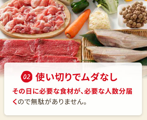 「献立を考えなくていい」「買い物に行く時間が減った」など時短・節約の声が多数。必要な人数分だけ届く使い切り食材でムダが出にくく、栄養士監修で健康面も安心です。